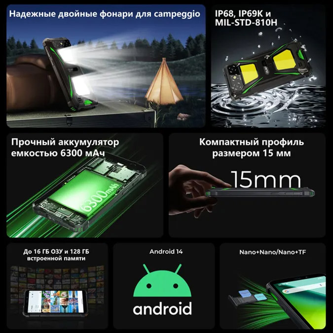 Oukitel G5 – противоударный смартфон с мощным двойным походным прожектором, АКБ 6300, толщина корпуса 15мм