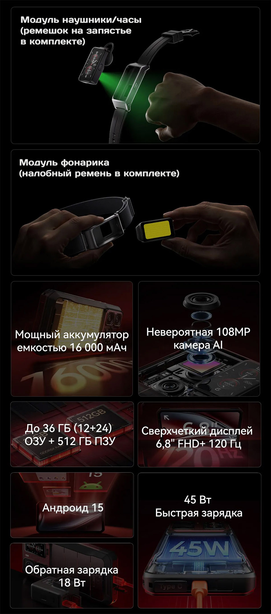 - Модульные съемные наушники/часы: Уникальная удобная функция! Ваш телефон - кейс для наушников.